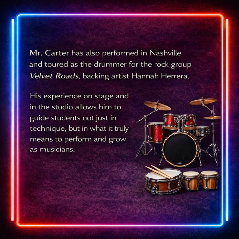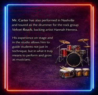 Meet Mr. Carter, his stage and studio experience is quite impressive. Mr. Carter recorded a six song ep with the rock group The Creeps, as well as performing with them at The Houston Live Stock and Rodeo; as well as being interviewed by a news outlet about the event. He has performed in Nashville and performed for nearly 4yrs in the Houston Band Velvet Roads supporting the artist Hannah Herrera.